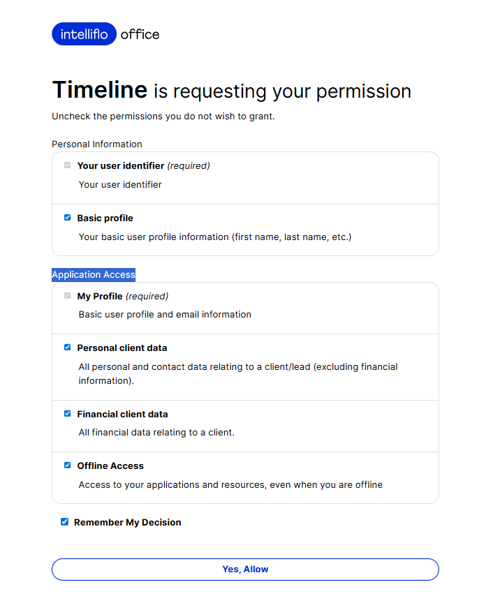 When you click ‘Intelliflo’, you will be redirected to their login page. After entering your correct credentials, you will be asked what data you want to grant us access to: