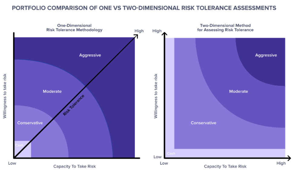 Kitces proposed a 2-dimensional approach to risk profiling, noting that ‘‘ having a low willingness to take risk, and/or limited capacity to afford risk, should be viewed not just as a component of the risk score, but a constraint to the proper portfolio the investor agrees to in an Investment Policy Statement. Which means investors who have low tolerance or low capacity should remain in conservative portfolios And similarly, investors with “just” moderate tolerance or capacity should stay in moderate portfolios, and not drift up to aggressive just because their other score is high.’