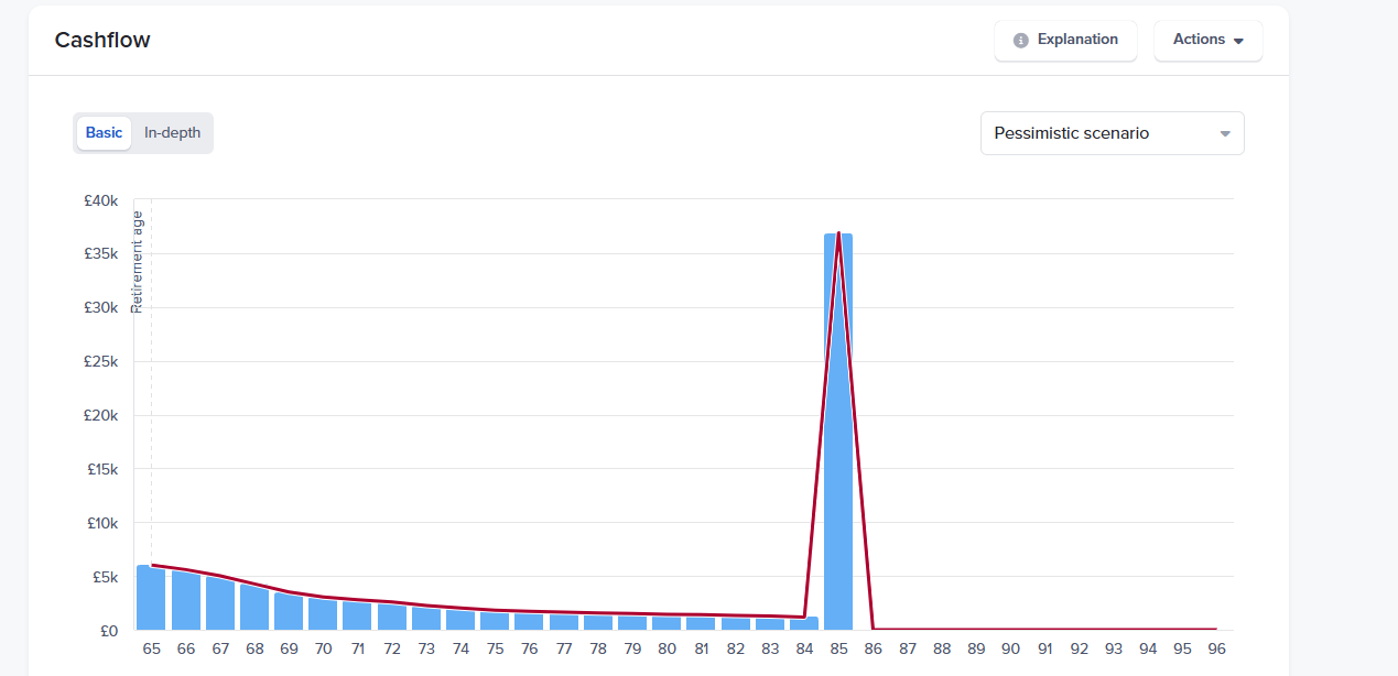 The chart above illustrates this payment structure with 0% inflation under a Monte Carlo scheme. In Timeline Planning using historical data, cashflow charts are always in real terms, adjusted for inflation to show the actual value of payments over time.