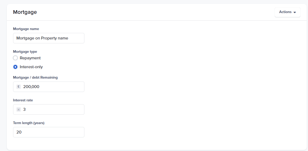 Under the property details, you can then add a mortgage. For an interest-only mortgage, specify the outstanding balance, interest rate, and remaining term.