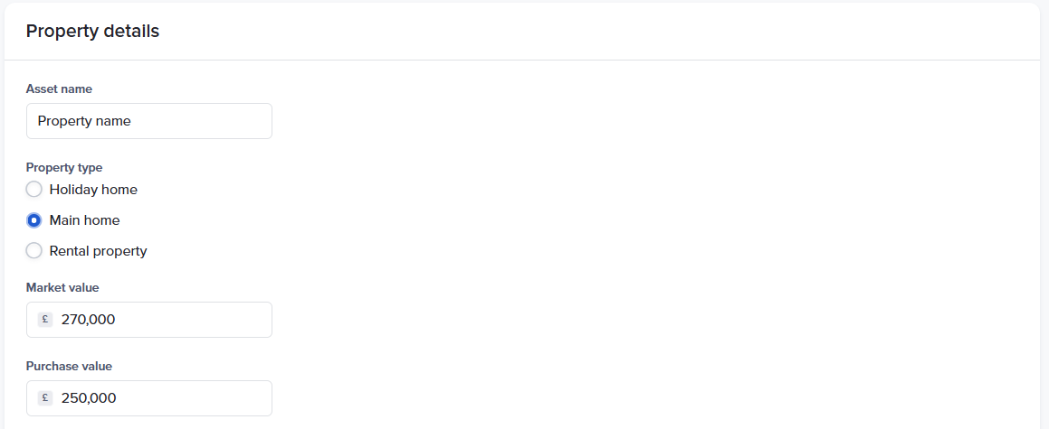 Timeline Planning allows users to model interest-only mortgages linked to a property. To set one up, first define the property under Settings → Assets → Non-liquid properties. Select the property type (main home, holiday home, or rental) and enter its market and purchase values.