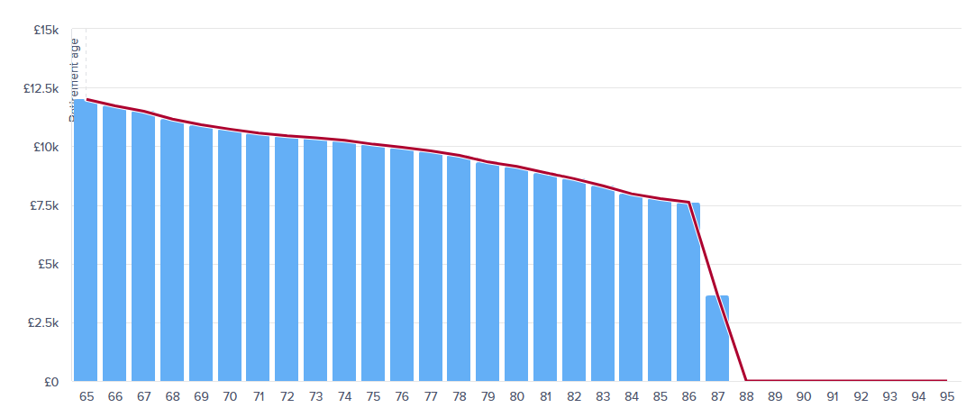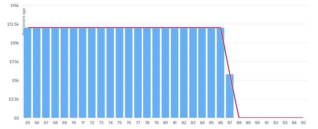 The chart above illustrates this payment structure with 0% inflation under a Monte Carlo scheme. In Timeline Planning using historical data, cashflow charts are always in real terms, adjusted for inflation to show the actual value of payments over time.