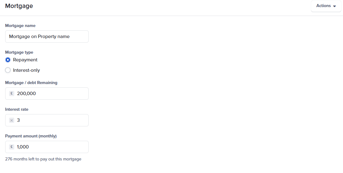 Under the property details, you can then add a mortgage. For a repayment mortgage, specify the outstanding balance, interest rate, and monthly payment amount: