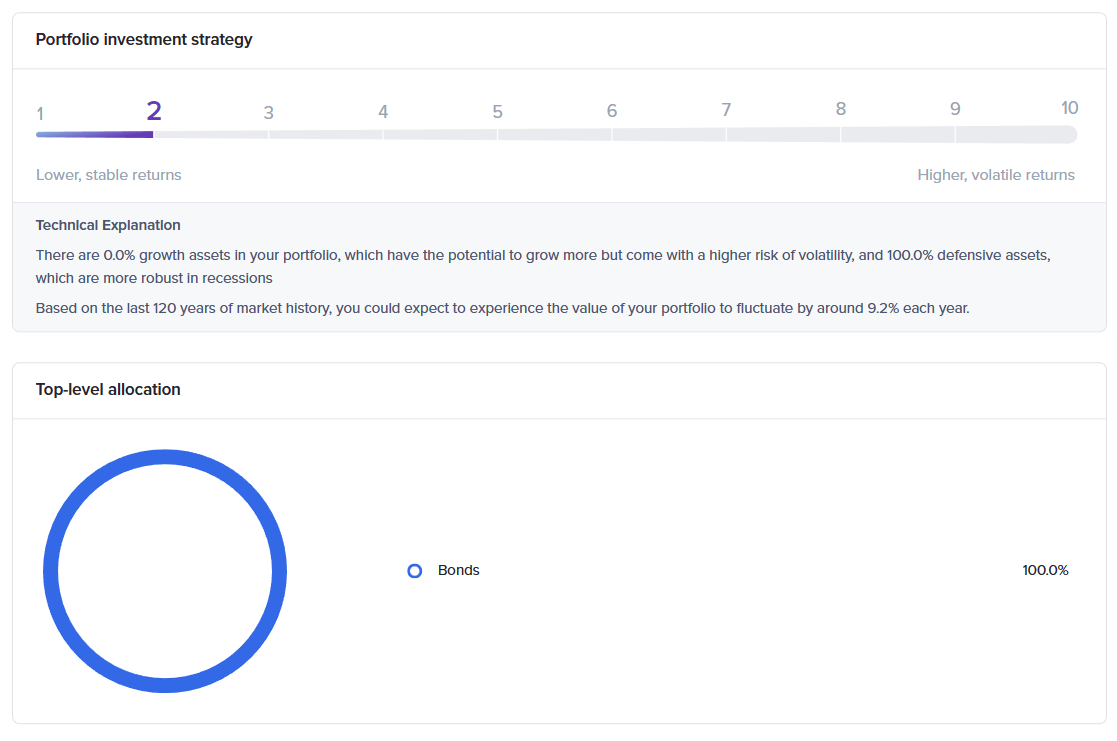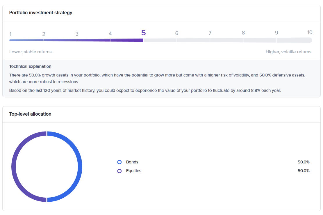 Our portfolio risk scoring process is comparative to global portfolio risk. The volatility dimension merely penalises portfolios with the same equity allocation as the benchmark global portfolio but with higher volatility. In simple terms, any given investment portfolio with X/Y equity/bond allocation that has higher historical volatility than the equivalent X/Y global portfolio will receive a higher risk score than the X/Y global portfolio.
