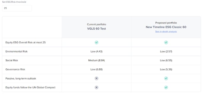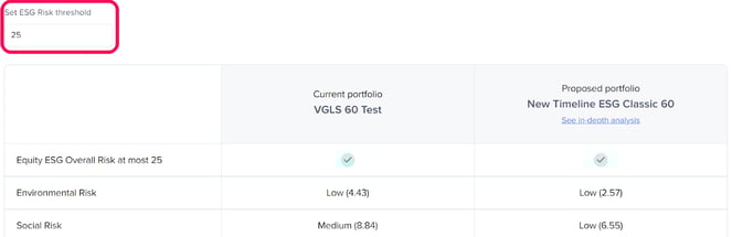 Here, you can set the ESG risk threshold for the equities in your client’s portfolio that you expect to be reached.