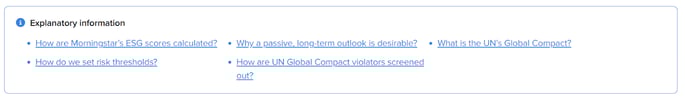 Even so, clients will have questions about what the scores mean, how risk levels are characterised and what the UN Global Compact is, so we have a range of small popup windows which explain each of these in client-friendly language.