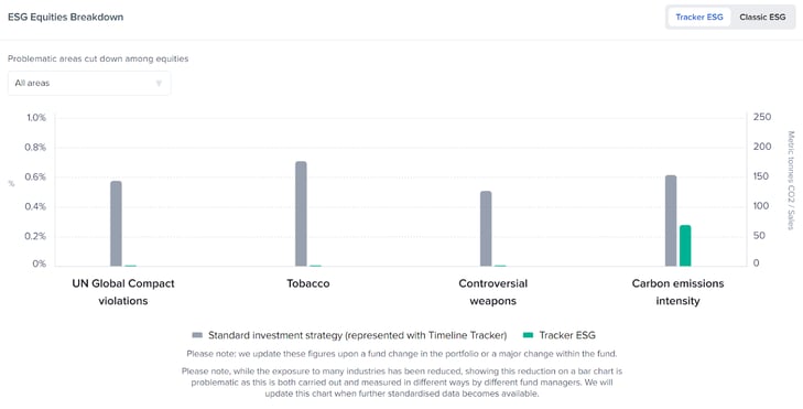 And for those clients who are keen to drill down into our ESG ranges, we have that analysis too. When you click on ‘Timeline Portfolio ESG Breakdown’ from the sub-menu, you can see how our ESG ranges compare to a standard investment strategy on screening out inappropriate equities. This visualises clearly what a big difference our ESG ranges make: