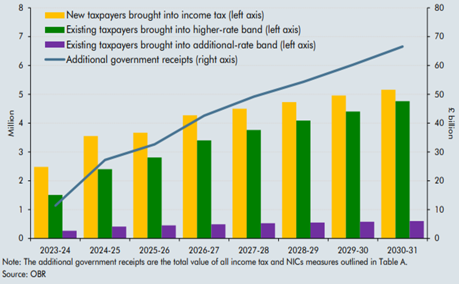 Perhaps the immediate elephant in the room to address is whether Reeves broke her manifesto promise. Whilst not directly raising taxes for the majority of people, the freezing of thresholds is the monetary equivalent of “it’s not cricket”. As a result of the freezes, many people will continue to suffer increased tax burdens due to fiscal drag and wage inflation over the coming years. The OBR has revised down its estimates of household disposable income to 2027, showing a gradual slowing of real wage growth, alongside rising taxes. This has a knock-on effect on household savings projections and potential long-term GDP growth for the UK. From the chart below, you can see that the majority of the impact of this freeze will fall on those who are transitioning from paying no income tax to the basic rate, as well as those who were previously at the basic rate and are now subject to the 40% band.